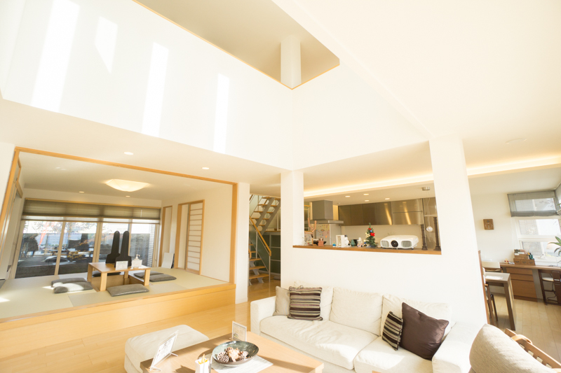完全な吹き抜けにしてしまうと2階のスペースが小さくなってしまう所を、あえて半分にする事で2階のスペースもしっかり確保。これにより遊び心あるスペースが生まれます。お家の性能にもこだわっているので建てた後のコストがかかりにくいのも魅力的。
