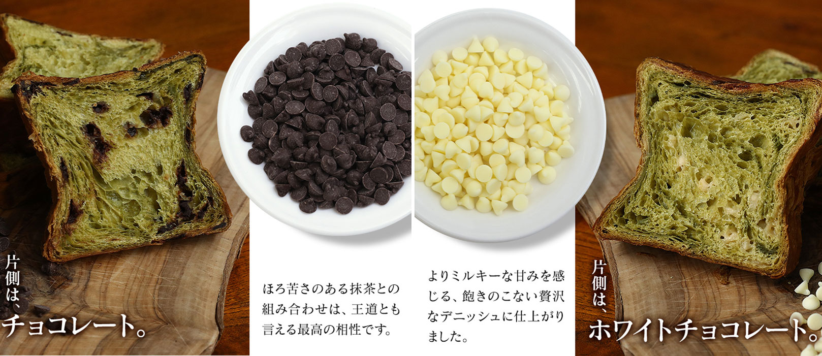 更にチョコレート・ホワイトチョコを半分ずつ織り込み、美味しさの相乗効果を生み出す贅沢な一品に。抹茶のほろ苦さと、チョコレート&ホワイトチョコの甘さの絶妙な組み合わせを体験してほしい!