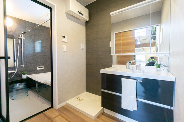 「洗面室・浴室も今までのナチュラルなコンセプトハウスとは違って、コンクリ打ちっぱなし風の壁紙や黒を基調とした洗面台・浴槽でかっこよさを強調しています!」