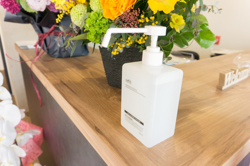 お店の入口には消毒液が。打ち合わせの際は十分な換気・消毒をしたうえで行うなどコロナウイルスの感染症予防対策も徹底しています。