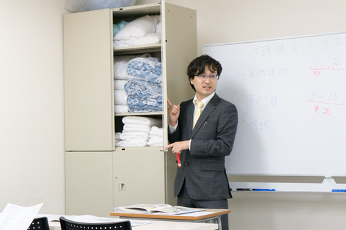 8回目の授業以降は実技演習もあるので、教室の棚にはタオルやシーツが収納されています。