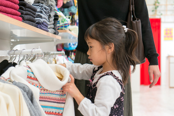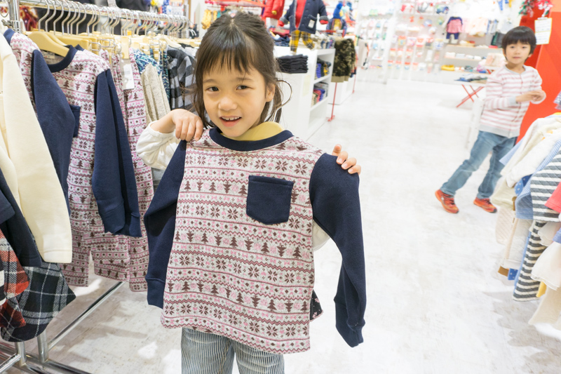 「こっちはどう?」季節感のある柄のトレーナー(¥1,404)も合わせる姉みつきちゃん。兄りくとくんがうしろでオシャレな妹を見守ります。
