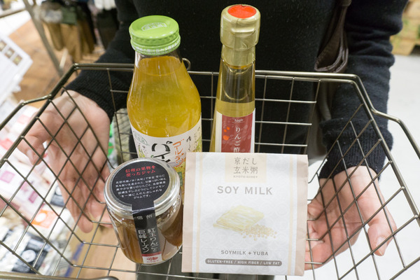 写真左上から時計回りに…ゴールデンパイナップルジュース(¥626)・りんご酢(¥972)・京だし玄米粥(¥594)紅玉りんごと巨峰レーズン コンフィチュール(¥886)