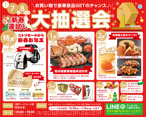 1月7日(日)8日(月・祝)にはお買上げレシート税込4,000円ごとに1回参加できる新春運試し大抽選会も開催!