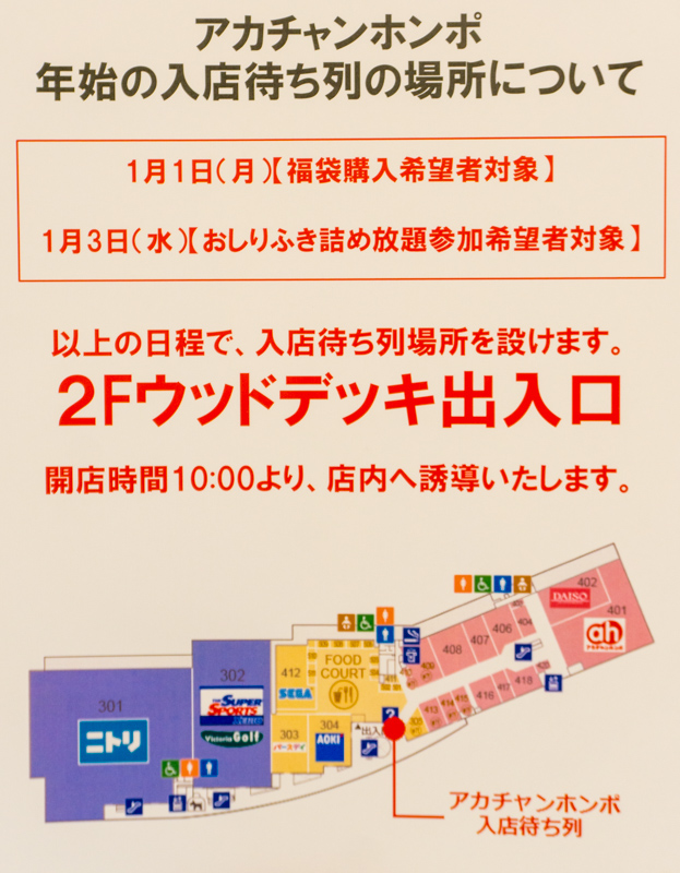 ちなみにアカチャンホンポの入店待ち列は「センターコート 2Fウッドデッキ出入口」となっていますのでご注意くださいね!