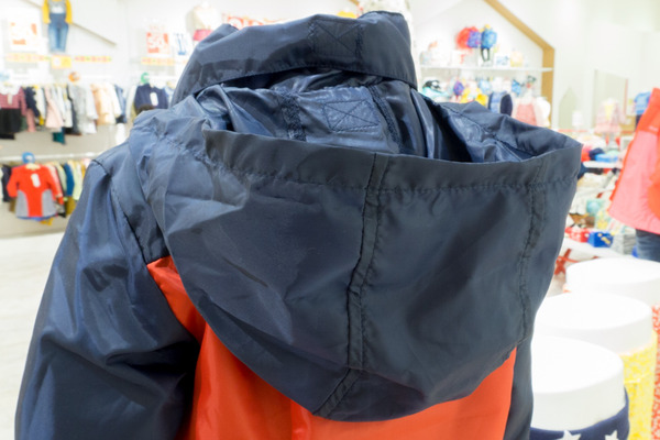 衿の部分に収納されているフードは、雨や寒い日などにはボタンを外して使うことができますよ!