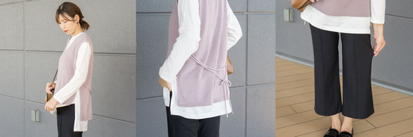 トップスはロンTとベストのセット商品です。ベストに付いているヒモでブラウジングすると、スタイルアップ効果もあります。インナーをシャツに変えたり、柄物に変えたりするとコーディネートの幅も広がるおすすめのアイテムです。