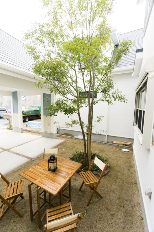 エントランスガレージの奥は芝生の広いお庭があります。シンボルツリーが植えられています!広いので何でも出来そうだ〜