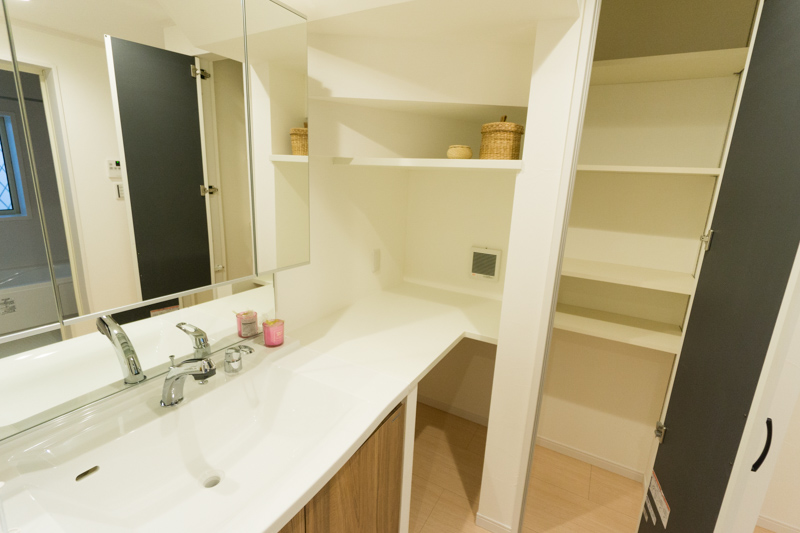 階段下のデッドスペースをうまく収納に活用した洗面スペースとリネン庫。家族4人分のタオルもばっちり入ります!そして、大きな三面鏡が嬉しい!
