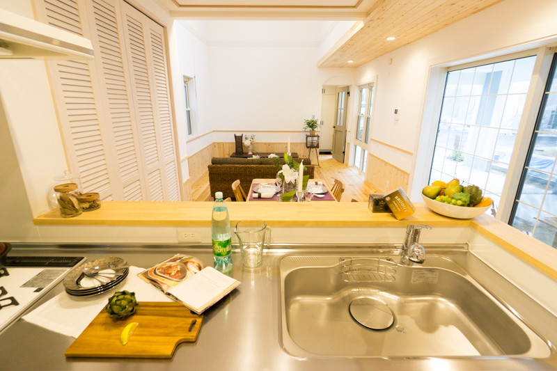 真ん中にある窓は先ほどのお庭に繋がっています。キッチンで作ったお料理をそのままお庭に持ち出すのにもスムーズですね!