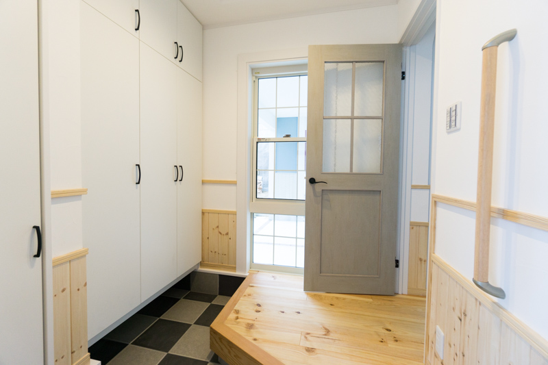 たっぷり靴が入るシューズクロークと土間収納。市松模様の床タイルも美しい!