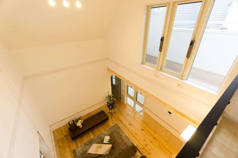 南側の光を1階へ届ける開放的なリビングの高天井スペース。ここからリビングに居る人とも会話が出来ます!部屋の境界線が緩やかになっているので家族の絆が深まりそう。
