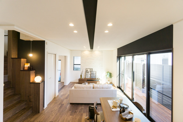 対面キッチンから見ても、天井の黒いラインがすっと通って、引き締まっていますね。
