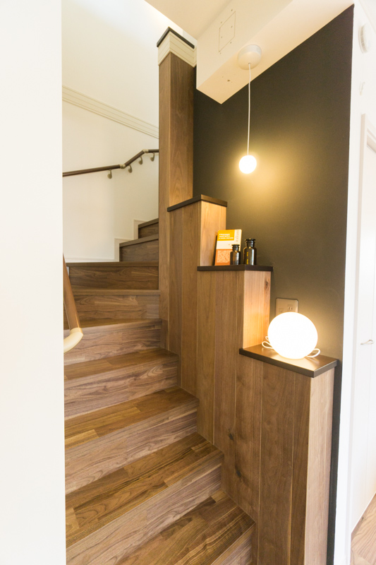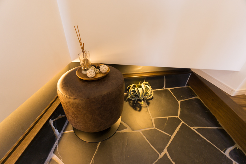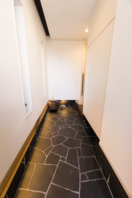 さりげない間接照明に照らされた、まるでオシャレなレストランやホテルのような玄関ホール。白と黒のコントラストがいい雰囲気を作っています。