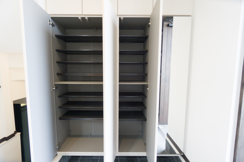 小濱さんこれもアウトドアが好きっていう設定から来ていて、玄関に荷物をたくさん置けるようにしています。中の段を変えてもらうと、靴じゃないものも置けるので、汚れたものもそのまま入れることができます。