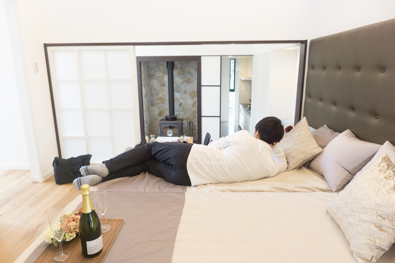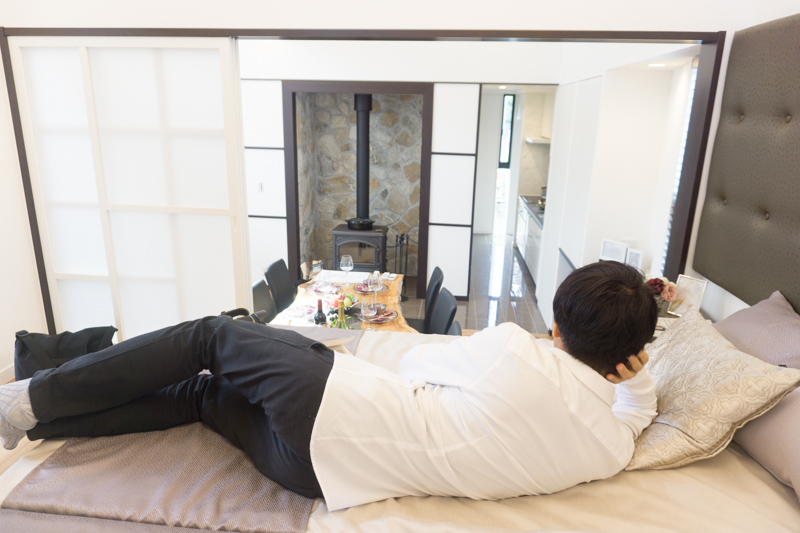 小濱さんここに寝転んだまま、リビングにある薪ストーブの火の灯りが見える設計にしてみました。