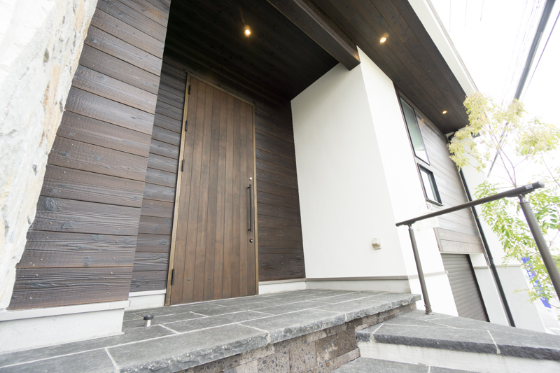 玄関の横の外壁はふんだんに石材が使われておりアクセントになっています。