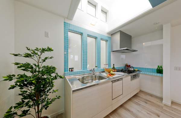 キッチンが明るいと料理しやすくていいですね。3階があるのに2階に天窓があるって不思議!早速出ましたね、1階と同じマリンブルーのタイルも素敵です。