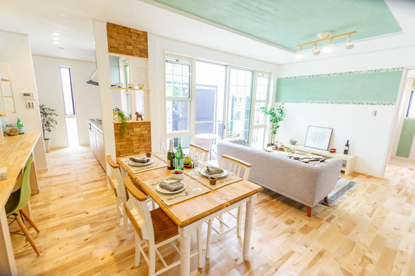 こちらのLDKは16.19帖。パティオにつづく窓を、掃き出し窓+両脇にも上げ下げ窓を付けて大きくとったり、キッチンの仕切りも飾り棚にして目線を抜いていることで、全体的に開放感があり広く感じるようになっています。