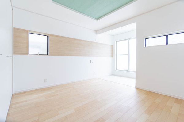 「主寝室は天井にグリーンの漆喰で壁面に木目調のアクセントや〜リラックスできそう
