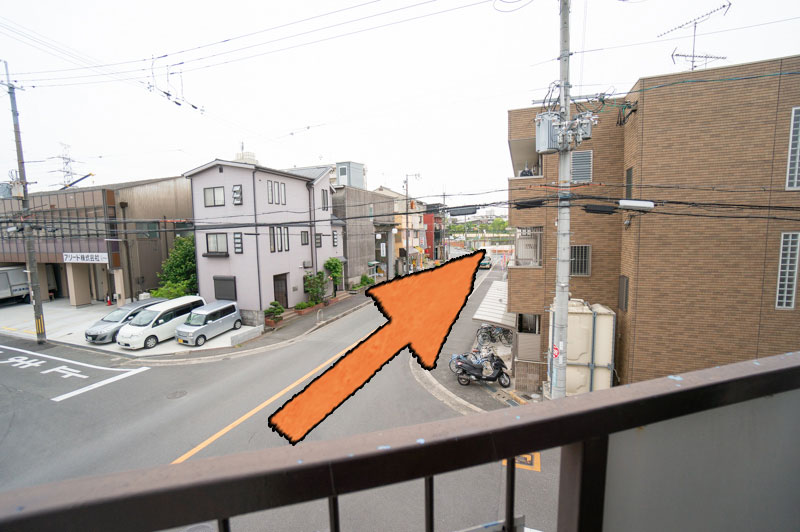 ベランダから見て、矢印の指したあたりの交差点にセブンイレブンがあります。