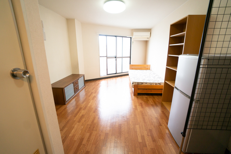 こちらのお部屋にはベッドやエアコンのほかにテレビ台や収納棚、冷蔵庫もついています。