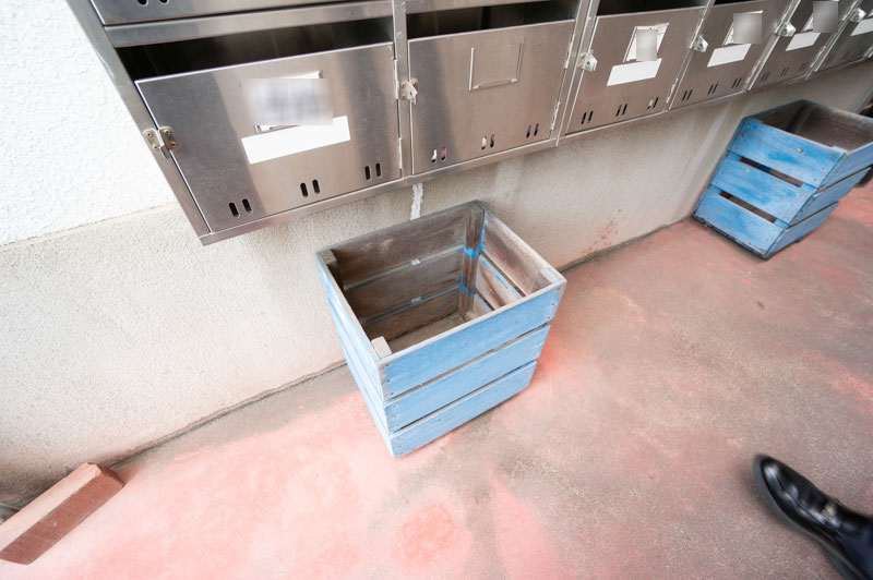 下に置いてある木箱は、郵便受けに入っている不要なチラシ入れなんだそう。