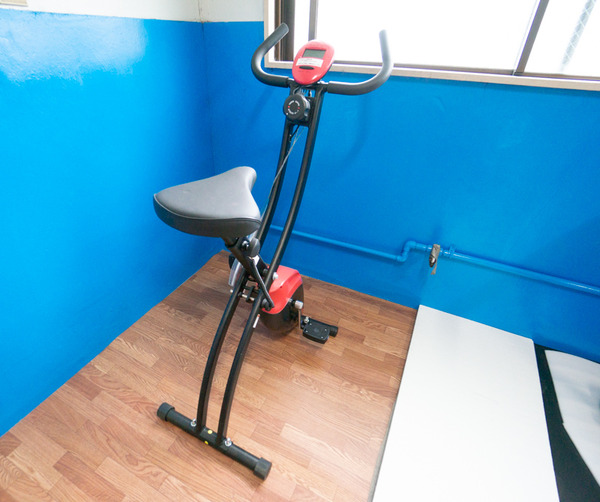 なんとなんと、元コインランドリーだった部屋を改装して、入居者さんがいつでも無料で使ってもらえるトレーニングマシンが置いてあります!