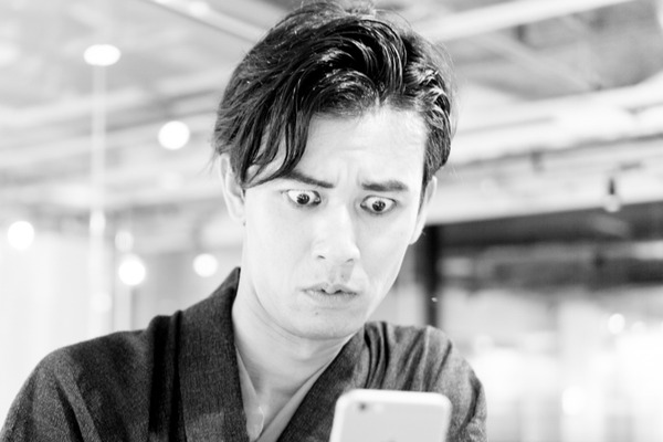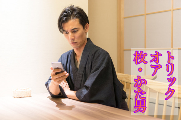 濃い顔でスマホをいじっているのは、枚方つーしん所属の新人歌手「さすらいの唄人形」のキャッチコピーでおなじみ(?)の枚・かた男(ひら・かたお)。