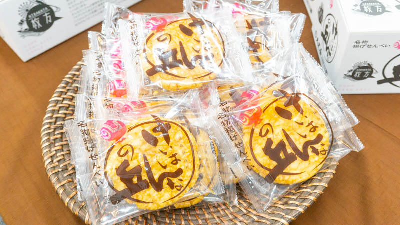 「ちなみに大黒屋で受けられる特典は、1,000円以上お買い物をしたらこの「けいはんなの丘」っていう揚げせんべいが1枚貰えるんやって!」
