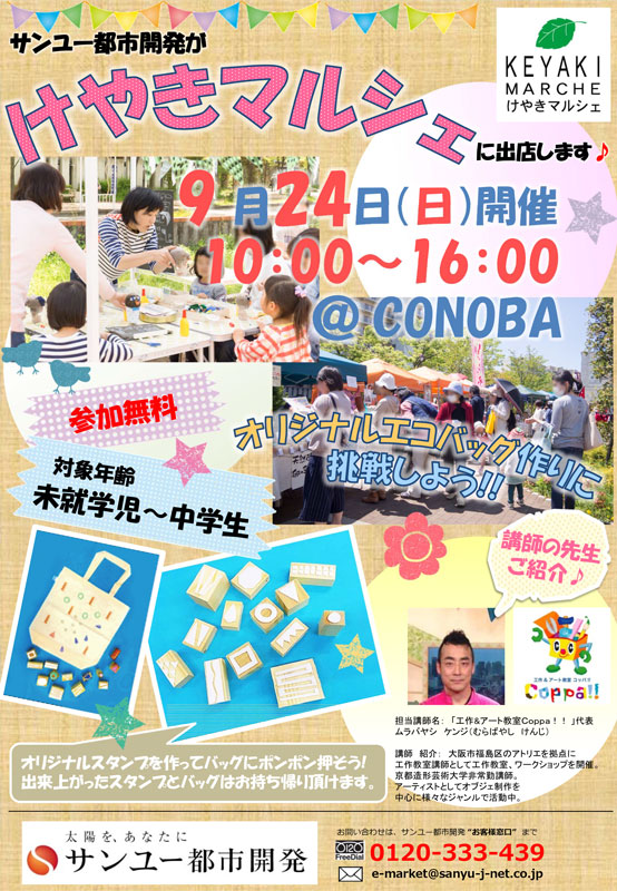 今月9月24日(日)開催のけやきマルシェではサンユー都市開発のワークショップが開催されます!