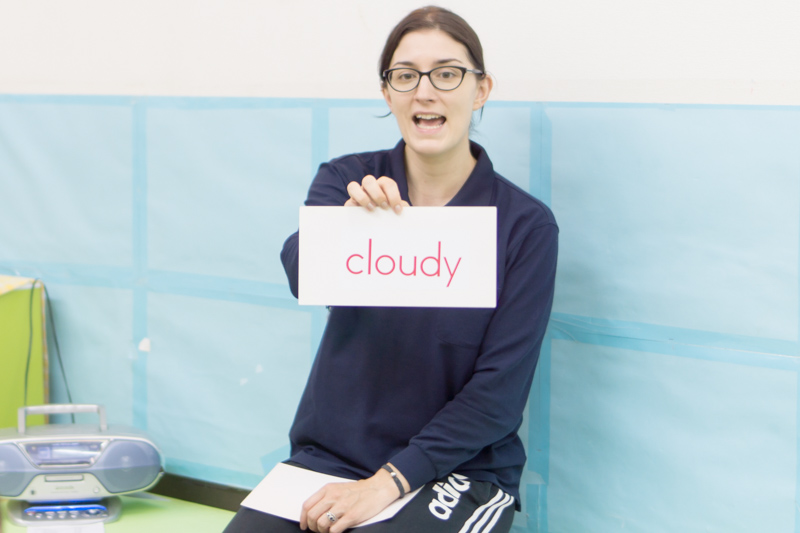 天気の歌ではSunny(晴れ)Cloudy(曇り)など天候を表す単語を音楽にのせて歌います。そしてRainy(雨降り)の時は…