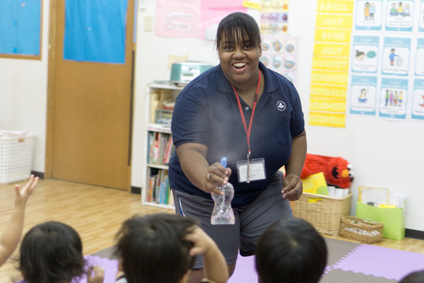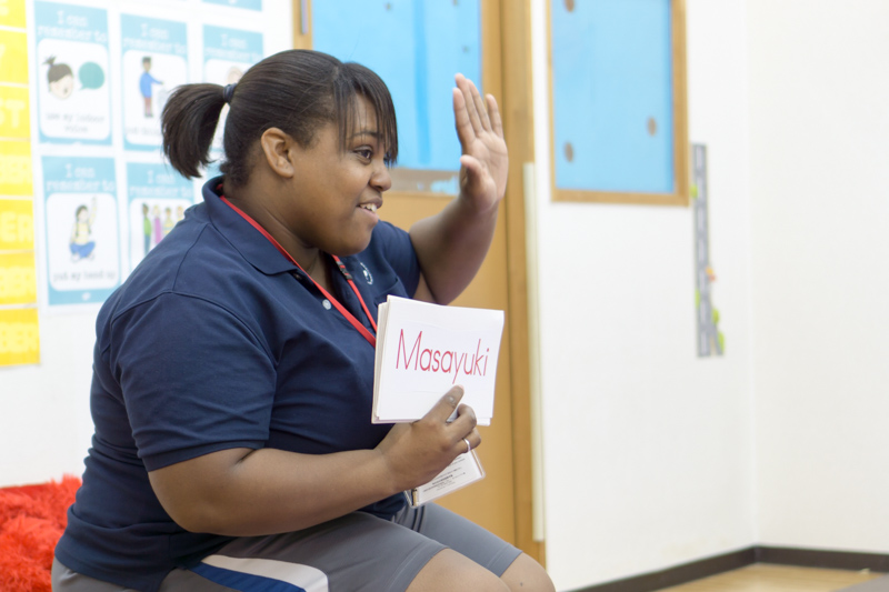 子どもたちは、自分の名前が呼ばれたら手を挙げ、“I’m here!” と答えます。