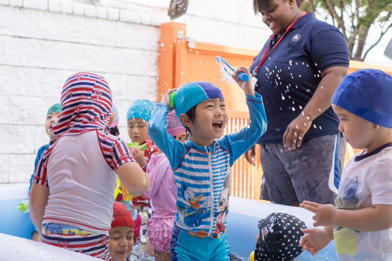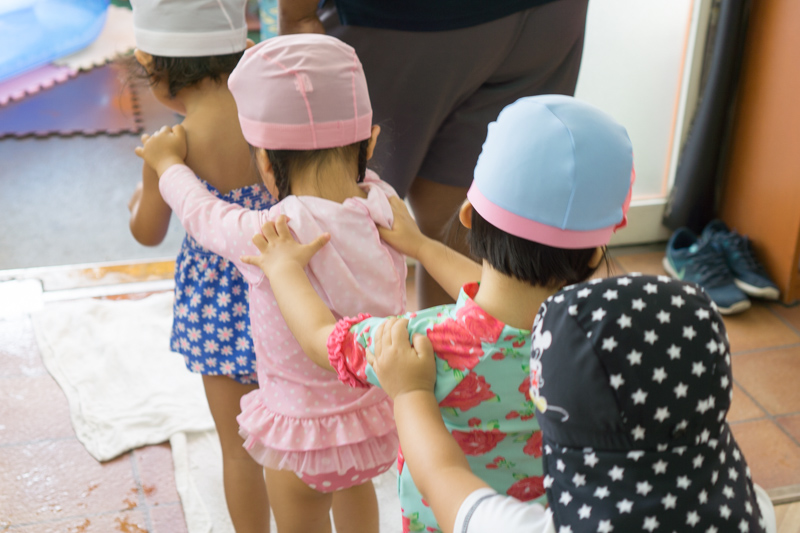 取材日のお外遊びはプールでした。(8月末までのプログラム)