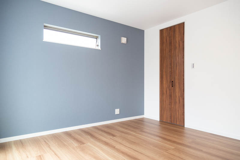 壁の一面がブルーグレーのアクセントクロスになっていて、落ち着いた雰囲気の寝室になっています。