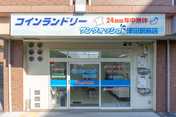 マンションの一角にあるサンウォッシュ津田駅前店。