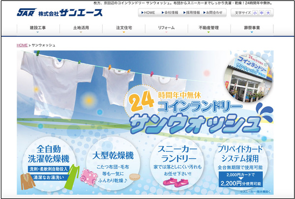 サンウォッシュは、枚方の不動産会社サンエースが運営するコインランドリーチェーン。