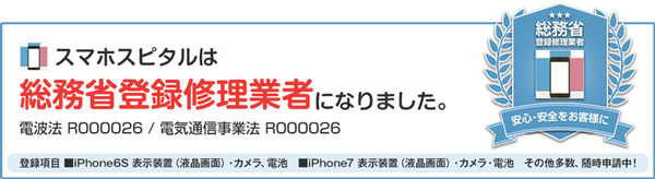 「スマホスピタルでは、品質と技術が一定の水準を満たしている業者の証である『総務省登録修理業者』の認定を受けているので、大切なスマホ・タブレットを安心してお預けください!」