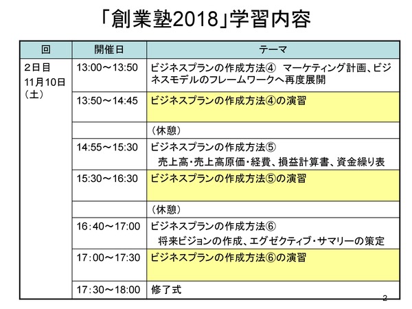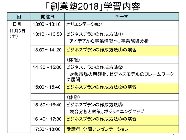 ※ビジネスプラン作成方法の「演習」では、演習用ファイル(PowerPoint、EXCEL)が提供されるので、可能であればノートパソコンを持って行くと、より理解が深まります。