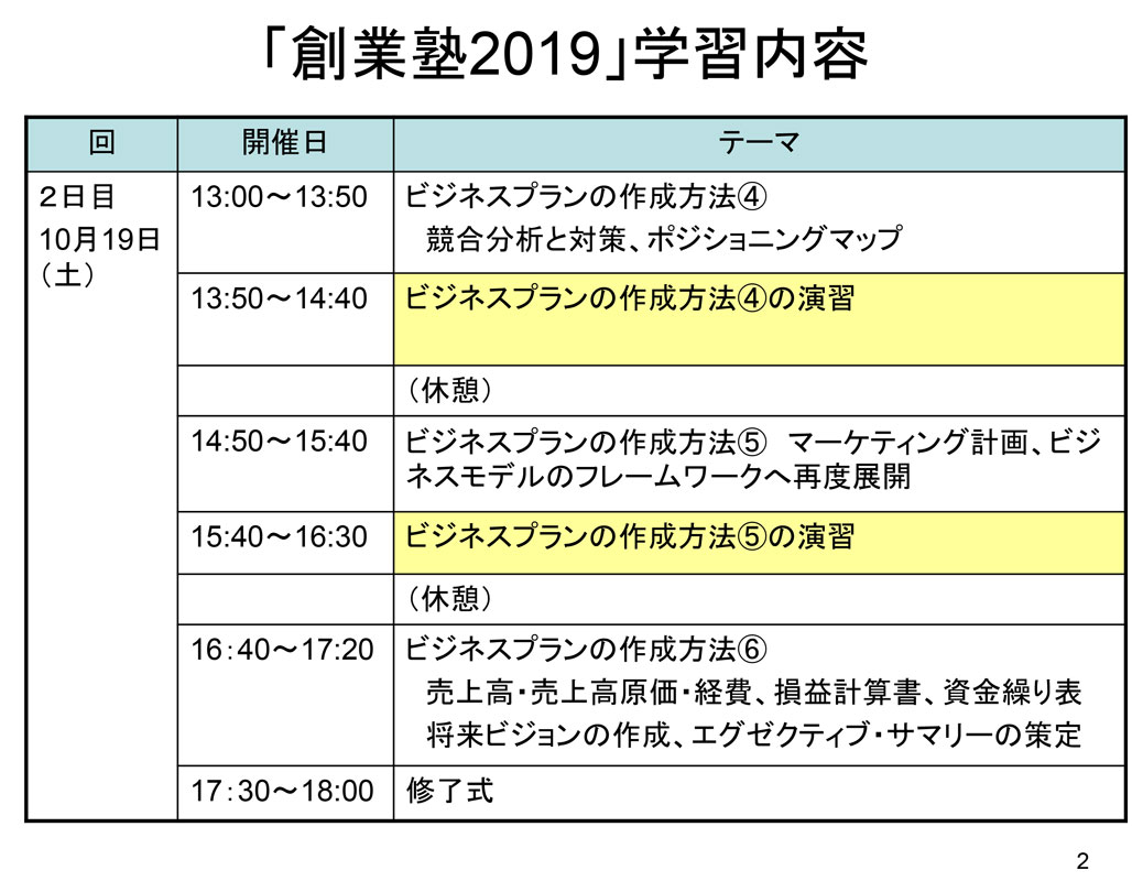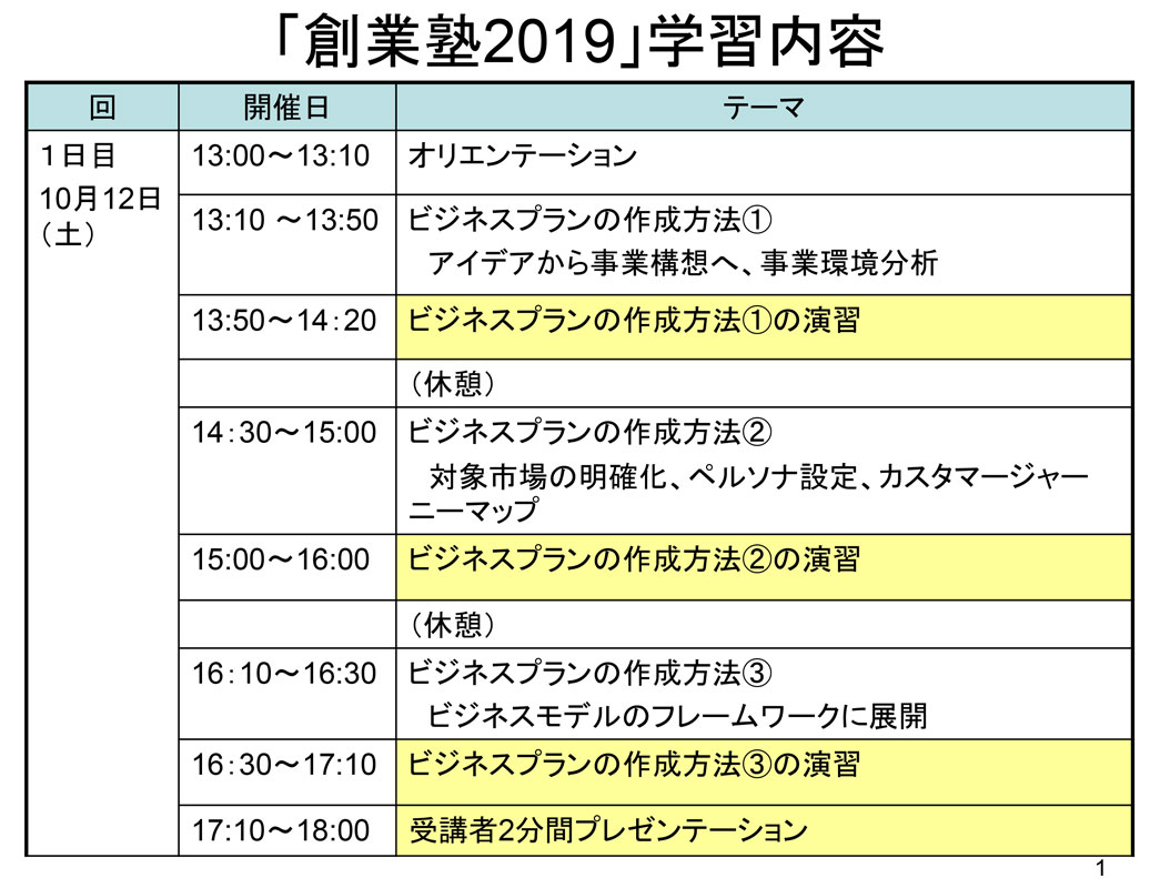 ※ビジネスプラン作成方法の「演習」では、演習用ファイル(パワーポイント、エクセル)が提供されるので、可能であればノートパソコンを持って行くとより勉強になります!