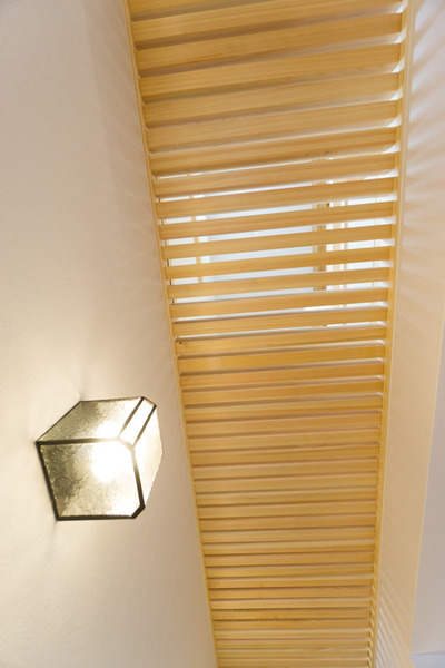 「これは「オガファーザー」っていう創建工房では標準仕様で使っている紙の素材です。上から光が格子状に差し込んでるから余計そう見えるのかな?」