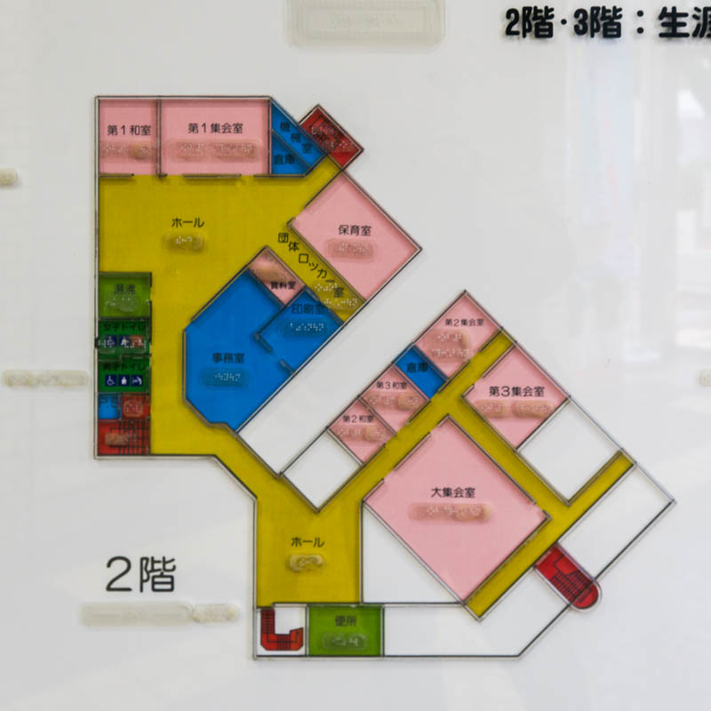 第1〜3集会室 / 第1〜2和室 / 保育室 / 授乳室 / 印刷室 / 団体ロッカー室 / 湯沸室 / 大集会室 / 事務室