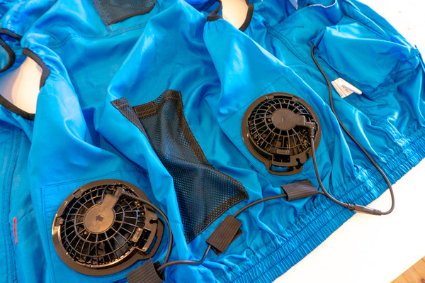 服の背中部分に小型ファンを2つ取り付けて、バッテリーに繋げて使用します。