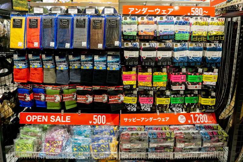 お店の中の方に進んでいくと、スポーツシャツなどのインナーウェアやアクセサリーアイテムも豊富に並んでいます。