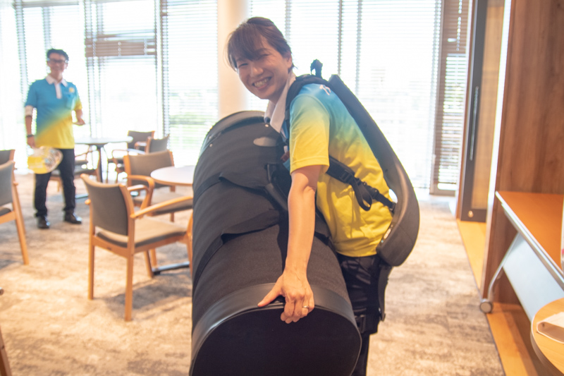 モーターの力で重いものを持ったときにかかる腰の負担を軽減する、まさに着るロボット。実際に空港での手荷物の積み込み作業などに導入されており、腰の負担の軽減化・生産性の向上を目的に運用されています。