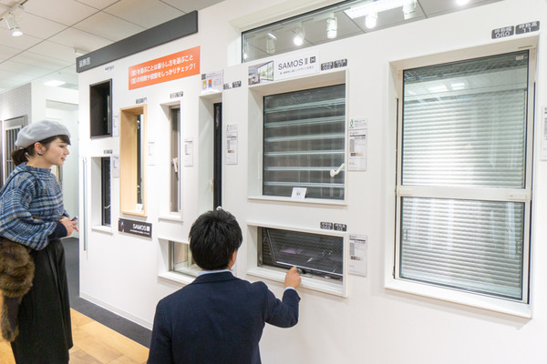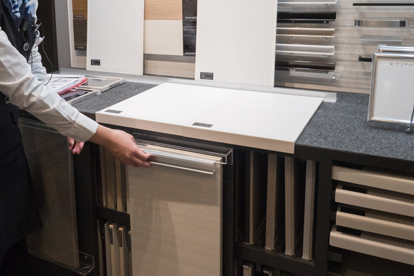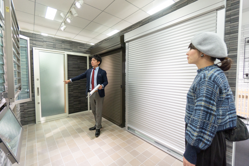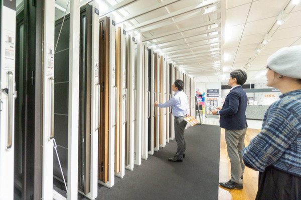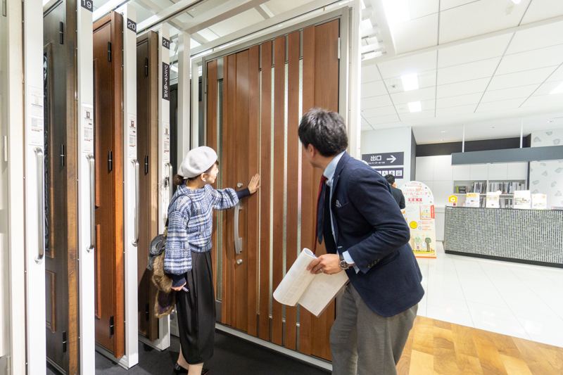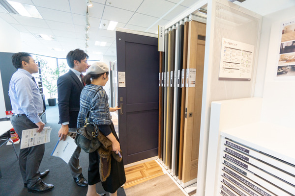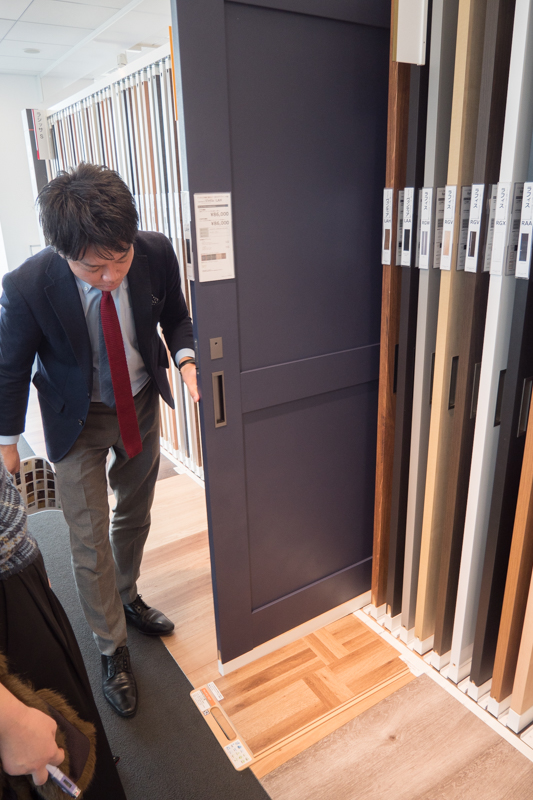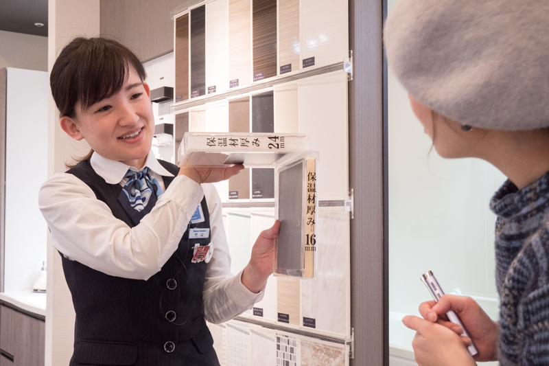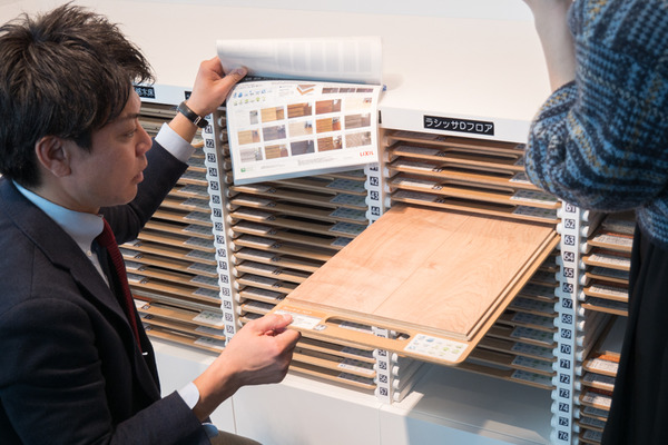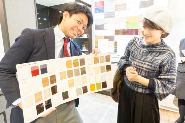 カタログだけを見て決めてもいいんですけど、サンプルが小さくてイメージできなかったり、印刷だと実物と色味がちょっと違ったりするんで、ショールームで実物を確認するんです。