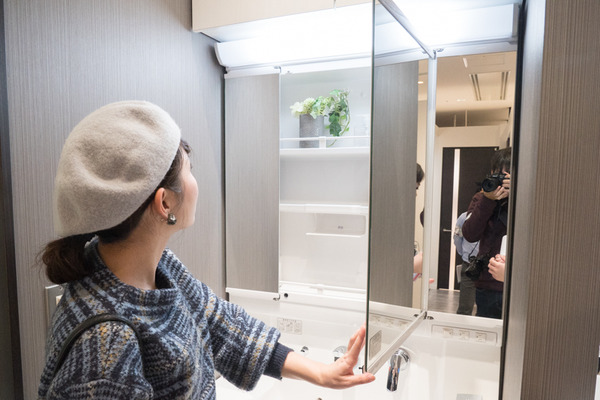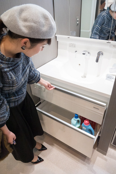 それに、蛇口は伸ばして使っていただけますよ。あと三面鏡と引き出しですね。