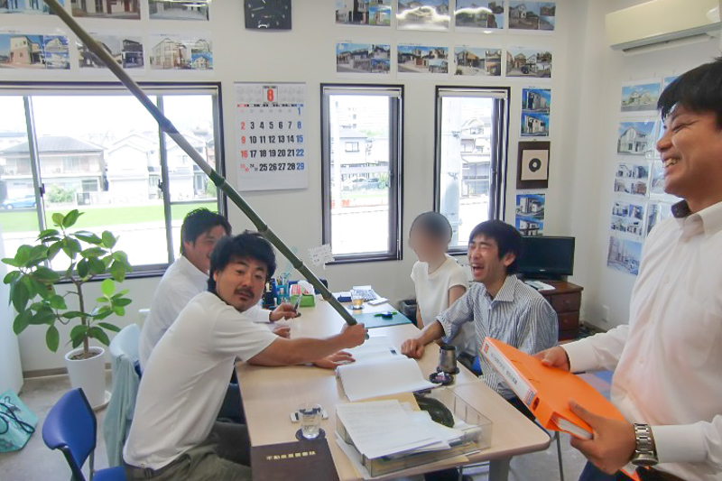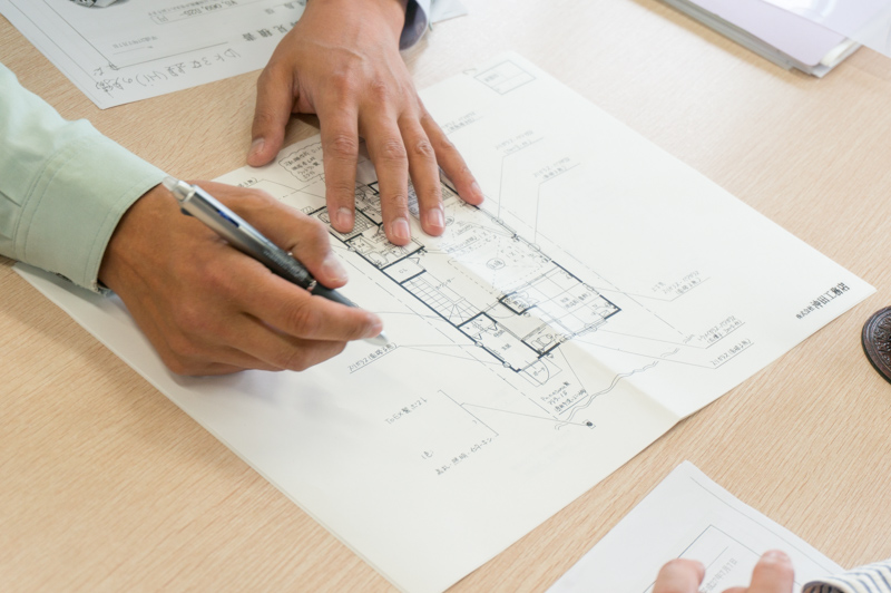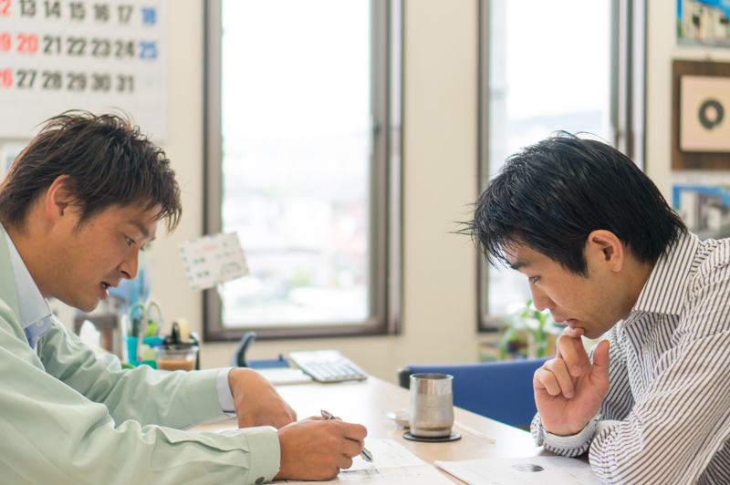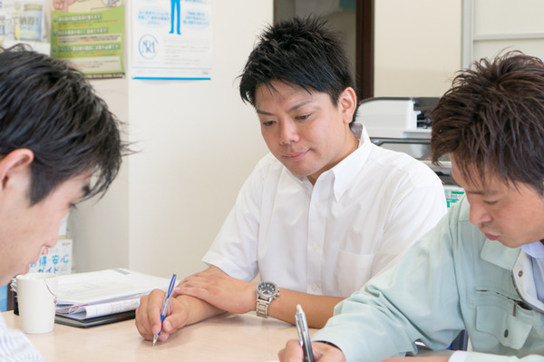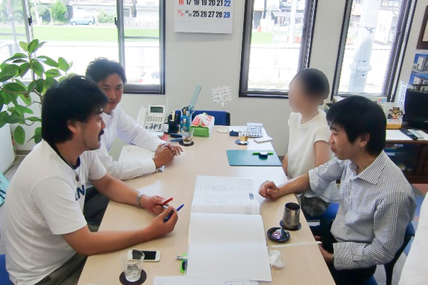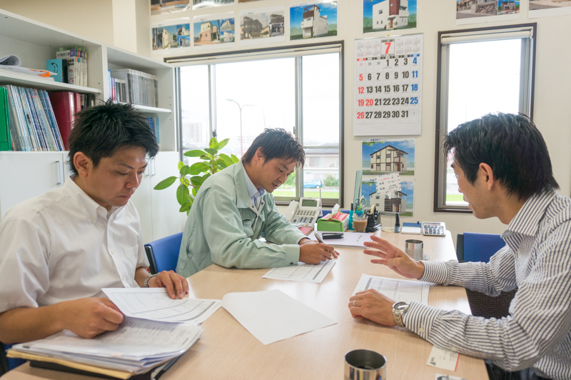 男3人が図面を囲み、外の暑さにも負けない熱量で打ち合わせを行っていました。
