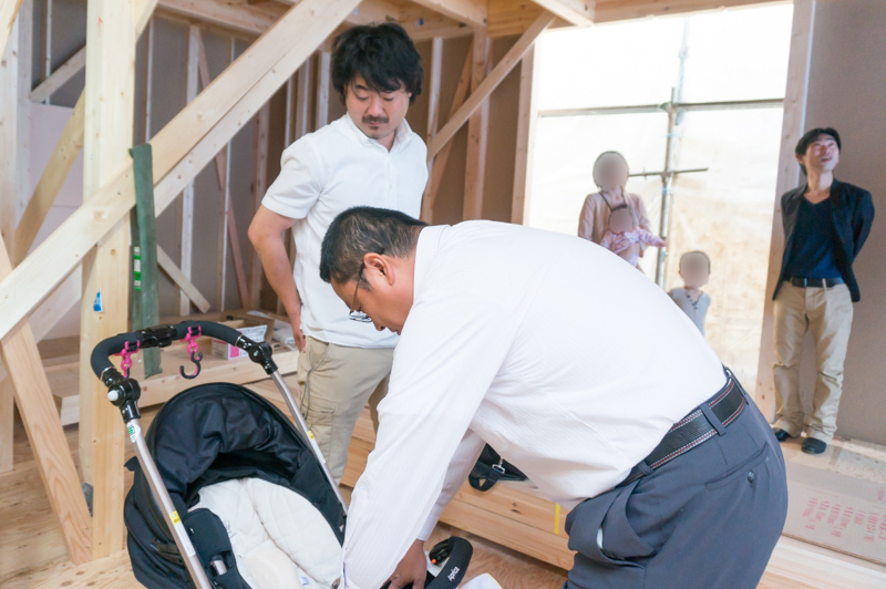 ベビーカーの配置を気にするトラスティ飛鳥山中部長と一級建築士の渡邊さん。
