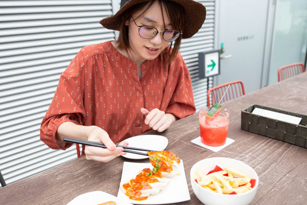 「わたしもいただきますー!ぱくっ…皮がパリパリしてて美味しい〜!味がしっかり付いているので、他のお酒にも合いそうですね」